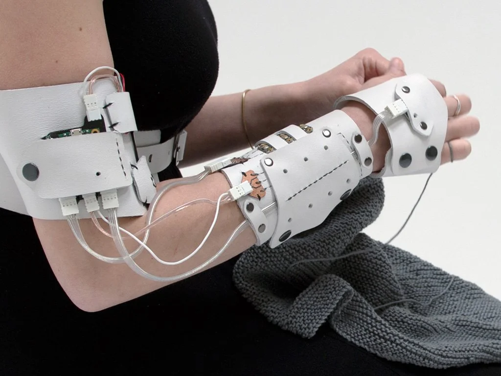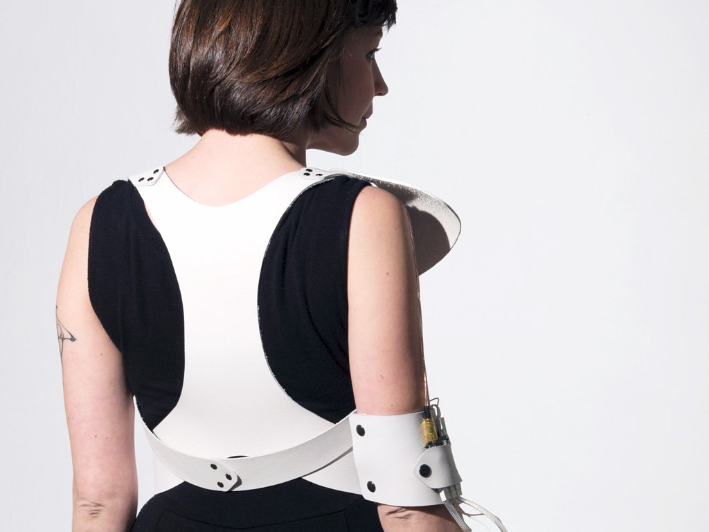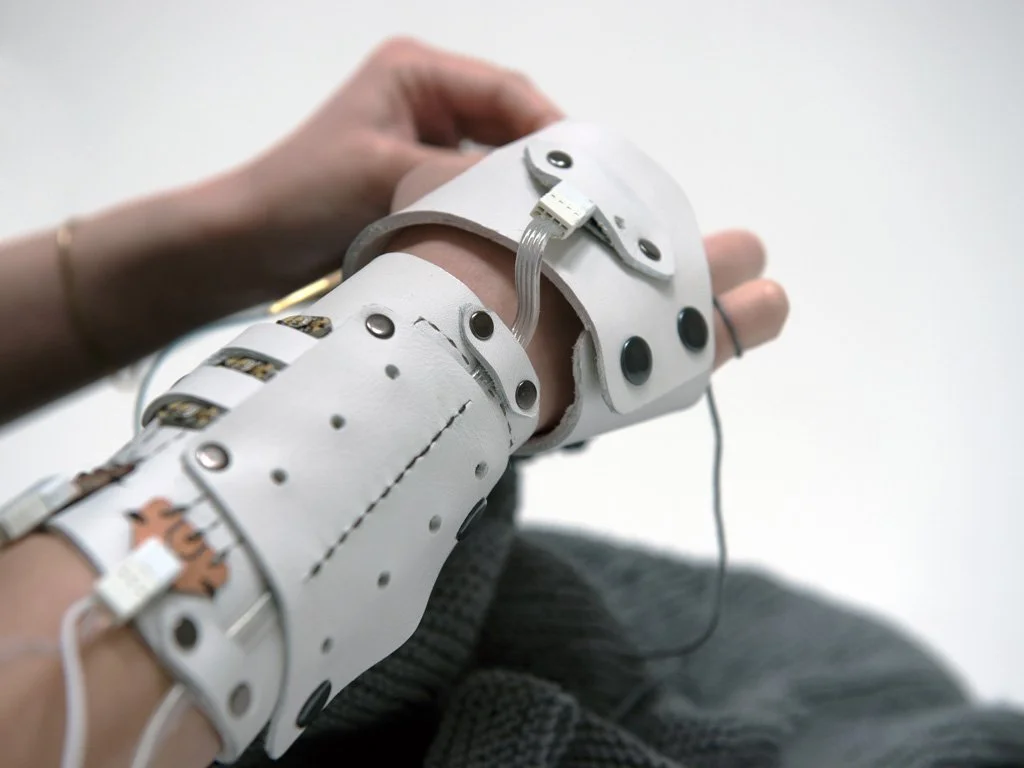 I constructed the harness and arm-piece from leather, then hand-stitched the components in place. The circuit is composed of a combination of pre-made and custom-designed circuit boards. The design is meant to be modular, flexible, comfortable, and evocative.