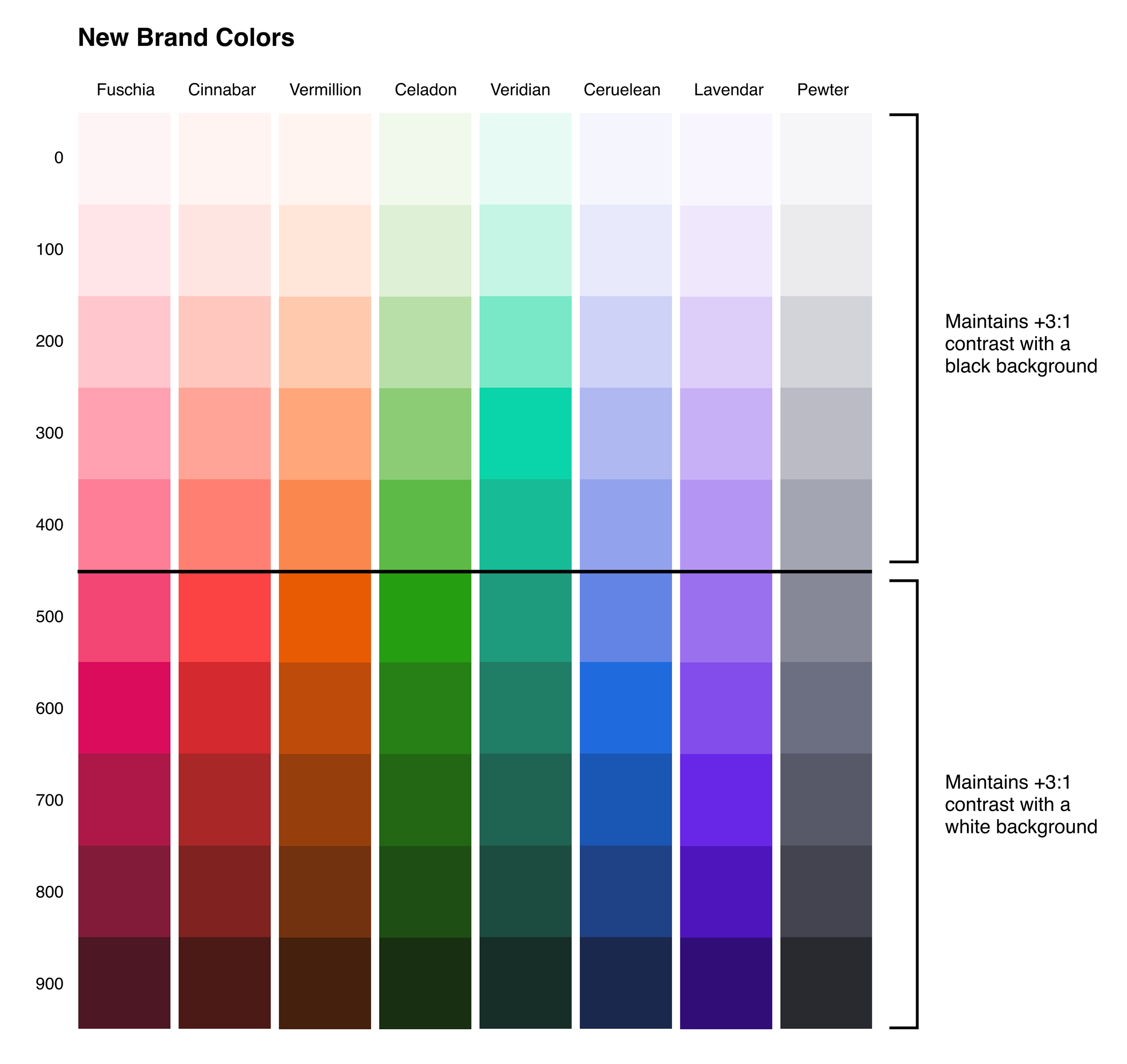 One way to make our palettes more accessible for users with color deficiencies is to choose colors from separate color ramps to place next to each other. For example, choosing Fuschia 500 and Vermillion 500 as neighbors would likely not be distinguishable for users with certain color deficiencies, but Fuschia 500 and Vermillion 700 would have visual contrast even in grayscale.