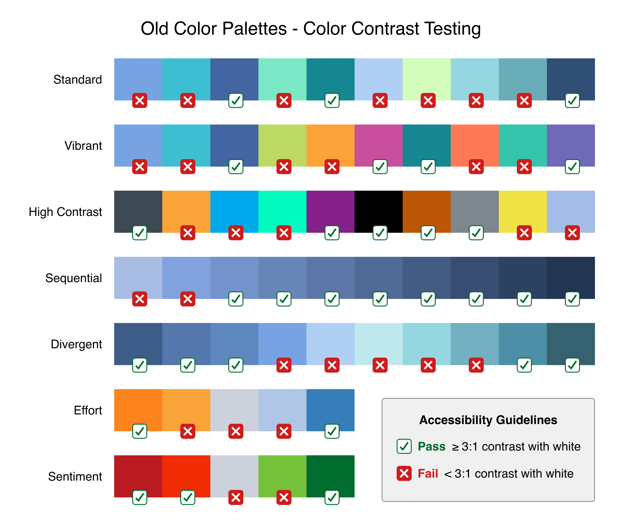 I conducted a thorough accessibility audit of the current palettes using tools like WCAG contrast checkers and simulators for various types of color blindness.