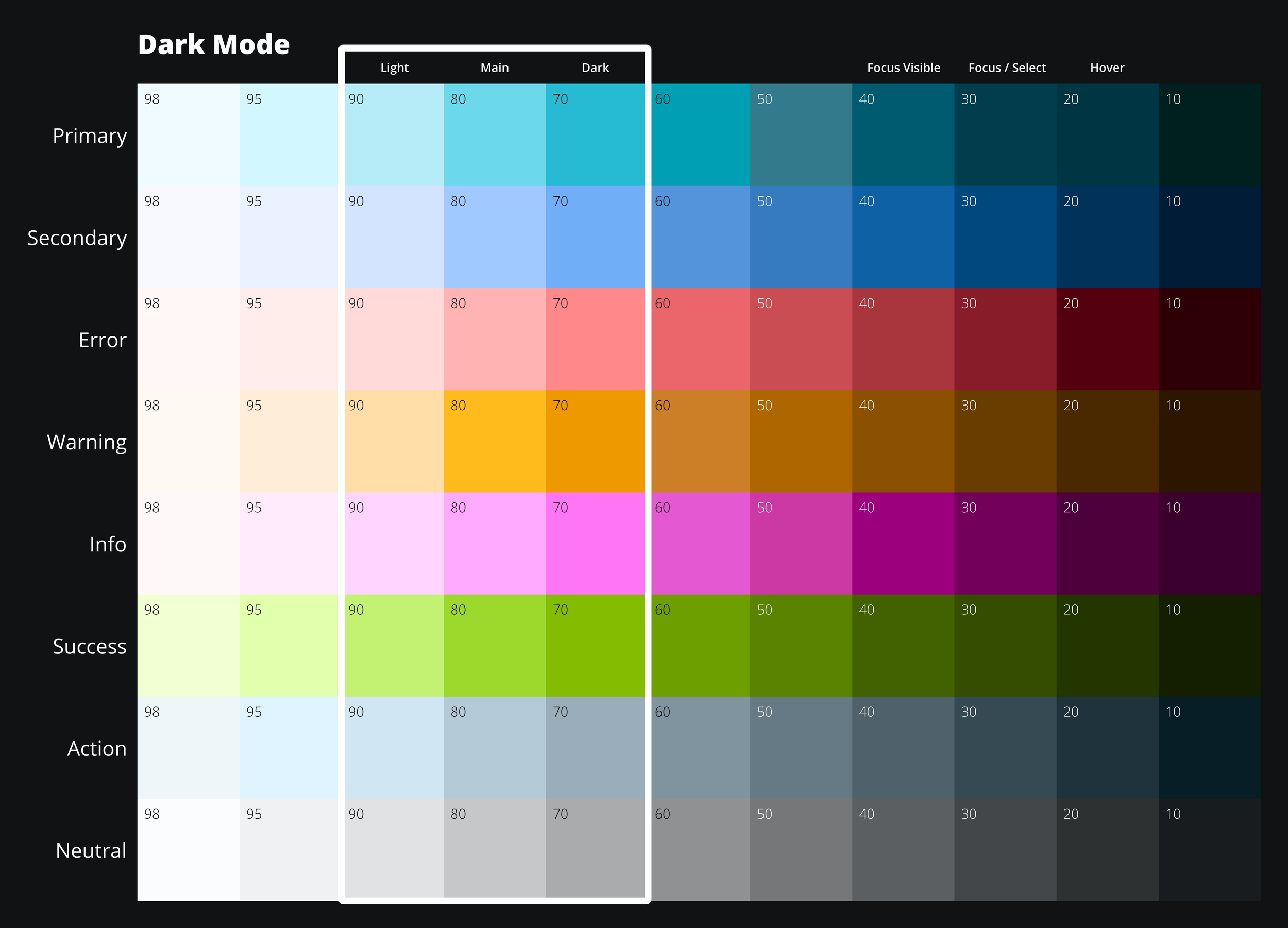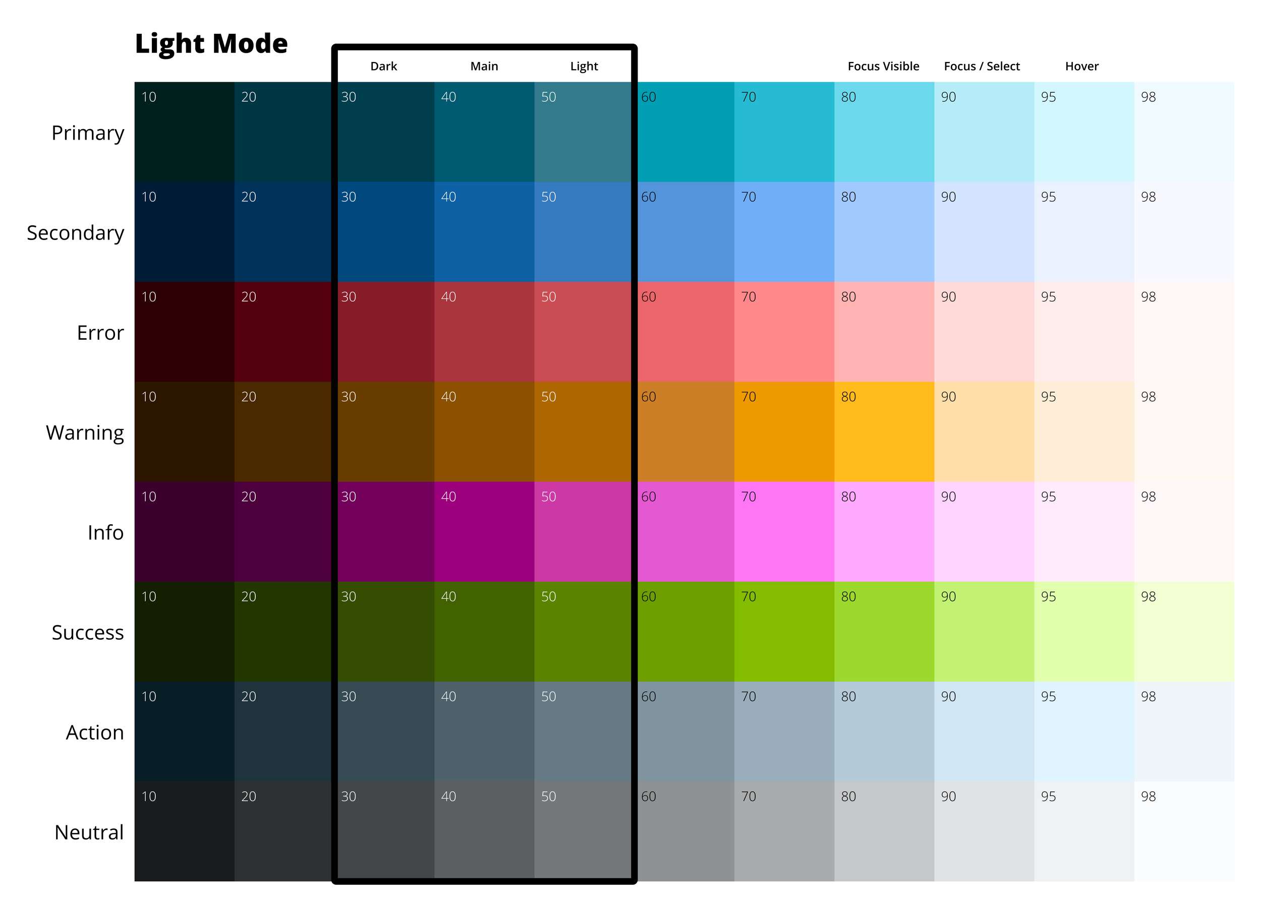 Initially I tried to follow the MUI color implementation exactly, but the colors relied heavily on transparency and created many accessibility issues while looking dull and inconsistent with our brand. I revisited the palette implementation and chose an approach that would use the brighter light colors in our palette.