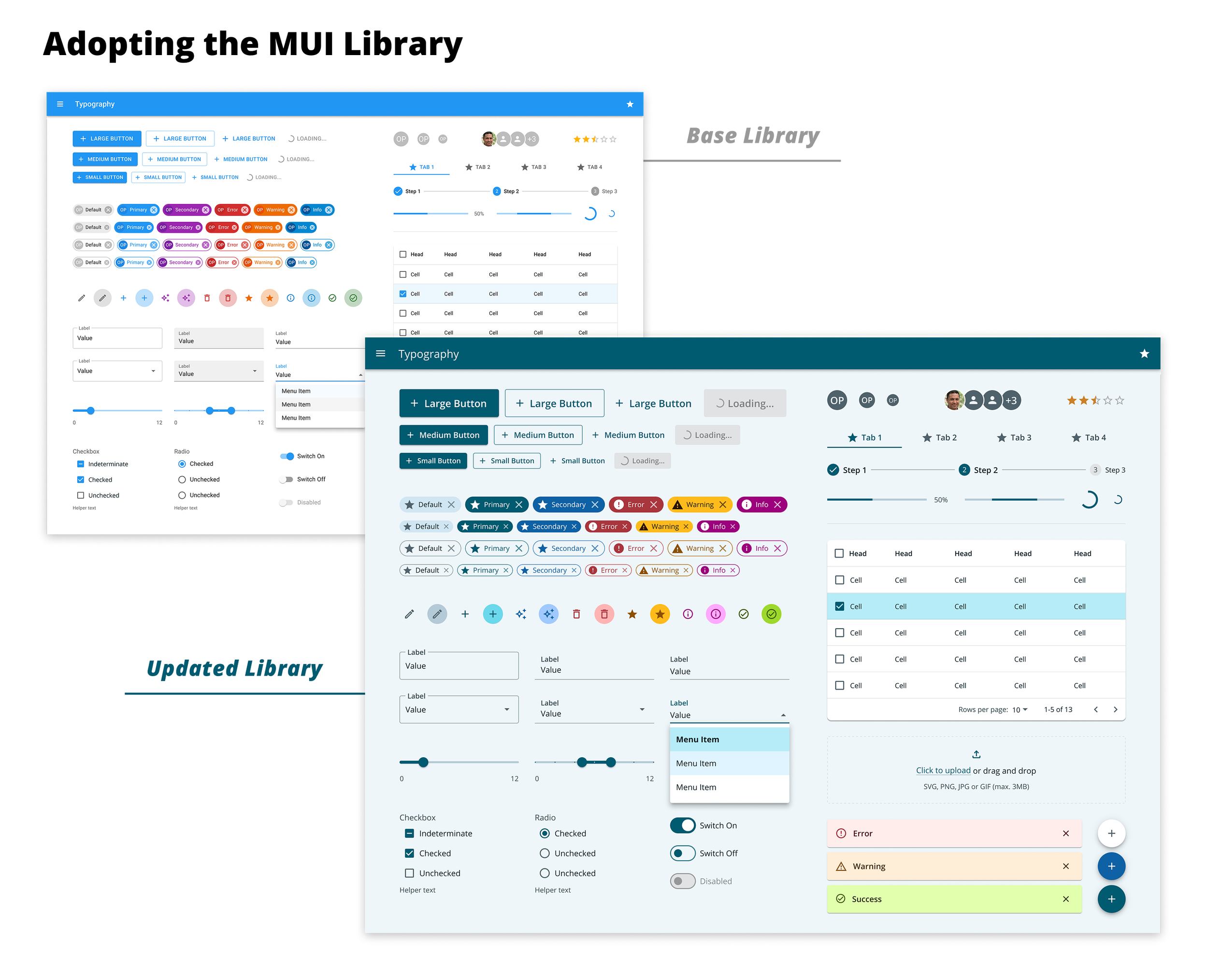 During the adoption phase, we focused on gaining alignment across teams and integrating the design system into active projects without disrupting delivery timelines. We created documentation, held regular check-ins with developers, and prioritized high-impact components to build trust and show immediate value. This phase laid the groundwork for broader adoption by demonstrating how the system could improve consistency and speed.