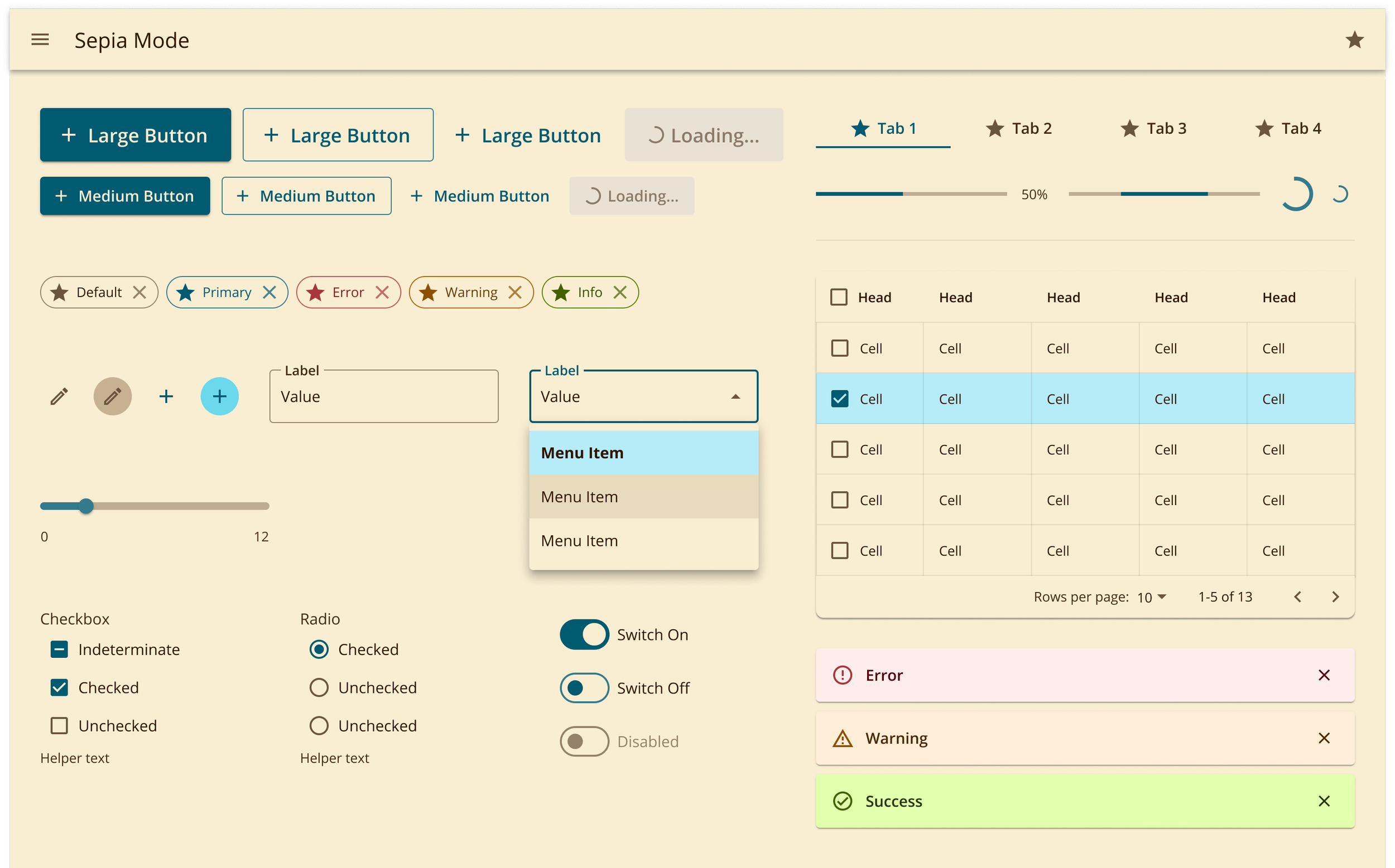For our sepia mode we swapped our neutral palette for brown tones, but maintained our primary palette to meet our customer’s requirements for consistent branding. Sepia mode is not necessarily an accessibility requirement, but is considered to be more comfortable for some learners. We allowed for some reduced color contrast in sepia mode in favor of color creating a subdued reading experience.