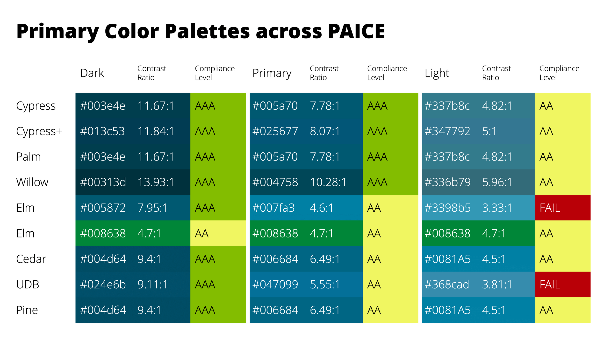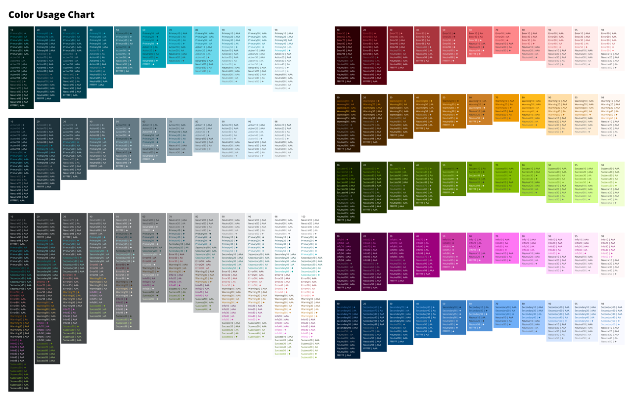 To ensure accessible color contrast across our design system, we tested color combinations and created a color usage chart. We tested the primary, secondary, and semantic colors against our 2 neutral colors, and removed failing combinations. We did not combine non-neutral colors to avoid potential issues for people with color blindness. We labeled all passing combinations based on their acceptable usage. Then we used this chart as reference when we assigned new color values to our library.