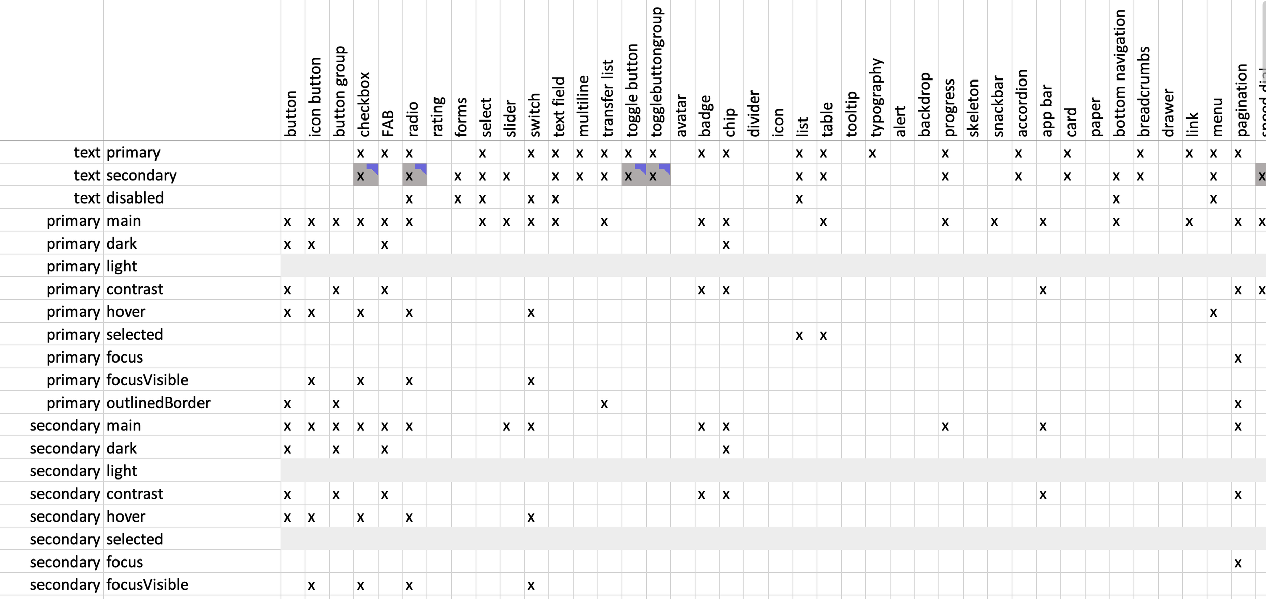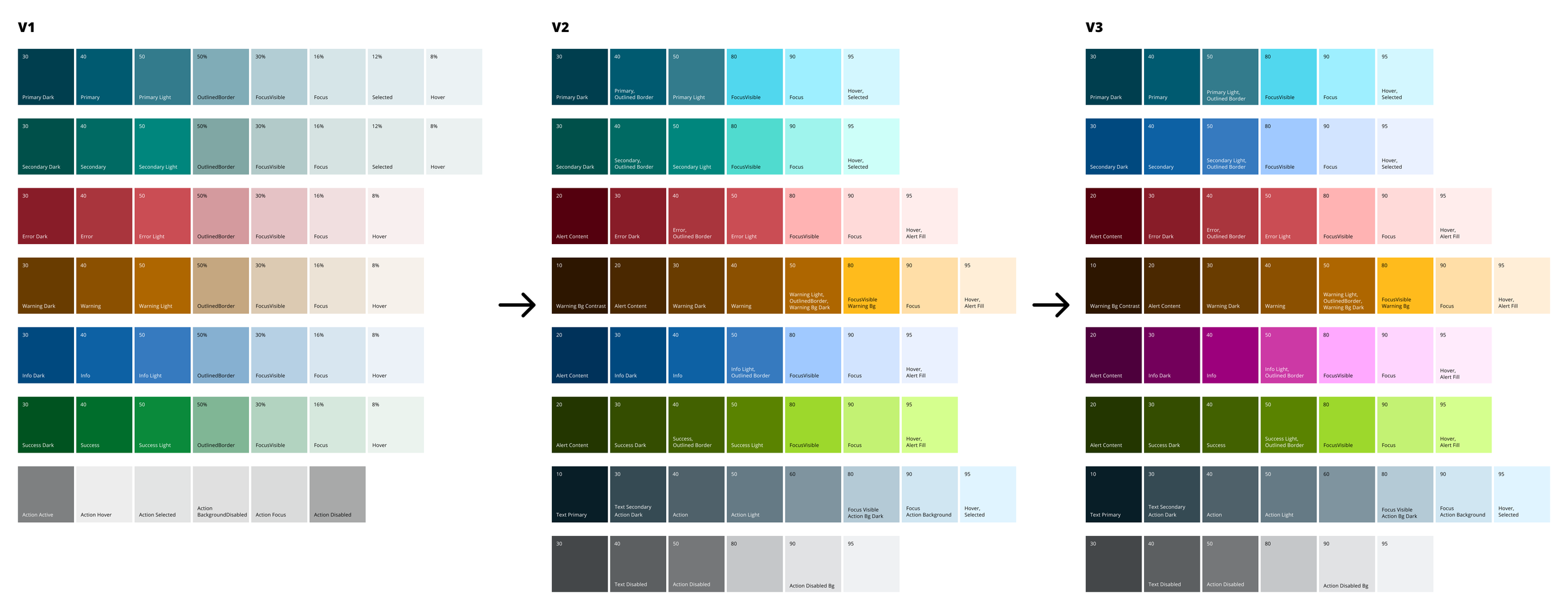 We audited the MUI Library by listing all color tokens, noting all their usage in components, identifying any inconsistencies with the code implementation, and noting unused tokens. This process ensured that we could make thoughtful changes to color tokens with predictable results. At this time we also tested color contrast across all components and flagged any accessibility issues.