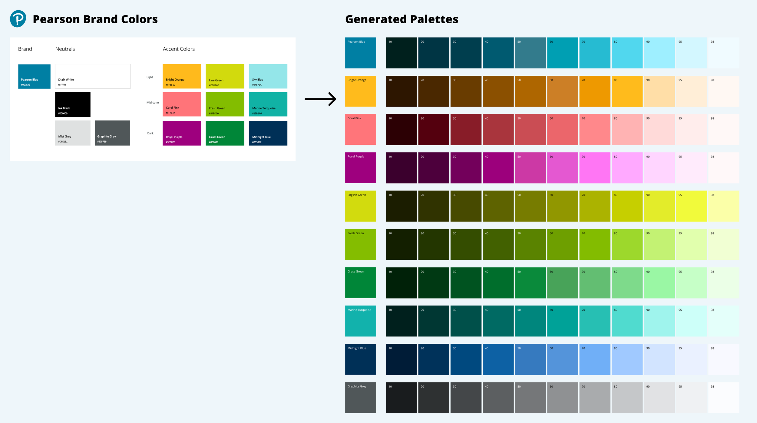 To create our color system I generated palettes using our Pearson brand colors. Each palette had 11 values to create a range of light to dark shades. I mapped the colors from the generated palettes to colors in the MUI library.