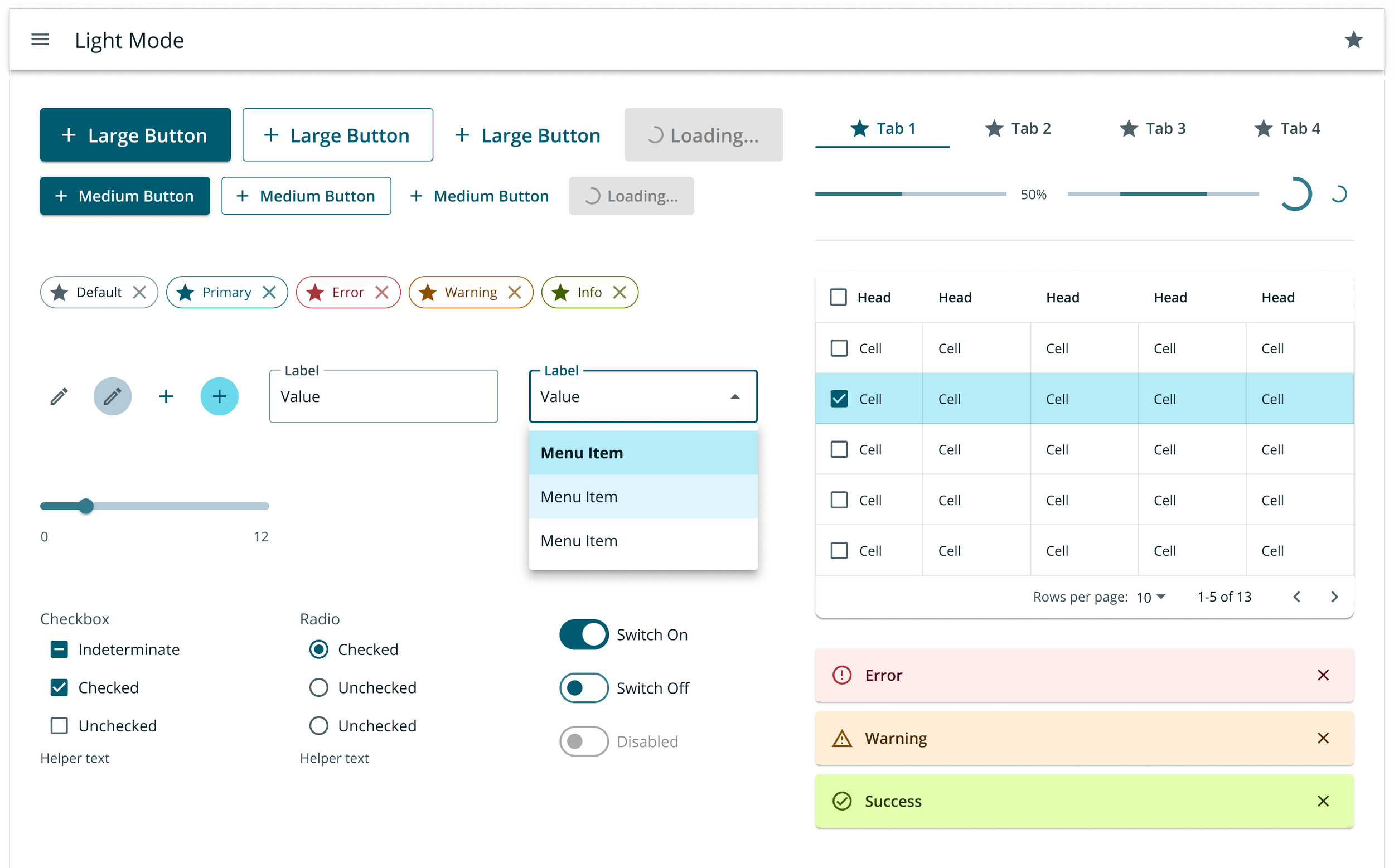 To create our library for Viewers library, we duplicated the library with our updated theme colors, then made adjustments to better fit our use case. We were able to remove components and variants that wouldn’t be supported for rendering (like the floating action button or FAB) or wouldn’t meet our stricter accessibility requirements (like the dense variant of menus that wouldn’t meet minimum size requirements for touch screens).