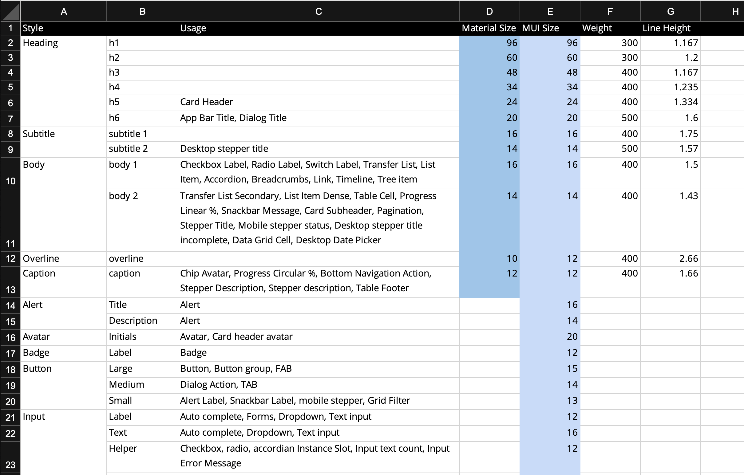 Similar to our workflow for determining colors, we analyzed all typography within the Material Design Guidelines and MUI components. It was important that we keep the same naming as MUI so that the typography changes could be implemented through the just theme file rather than customized per component.