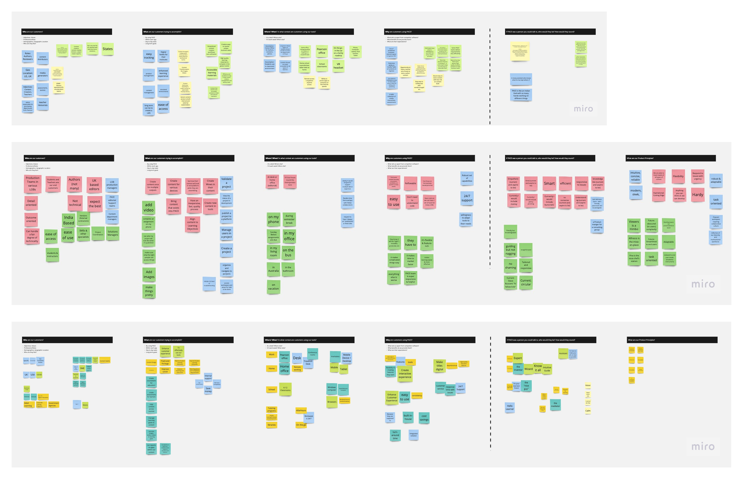 To create our Product Principles I hosted multiple collaborative ideation sessions combining my design team with leaders across PAICE, then consolidated the results into a set of 5 Product Principles. In one session participants were asked questions about who our audience is, what they’re trying to accomplish, and why they do or should use our tools so that we could ultimately answer who we want to be to them.