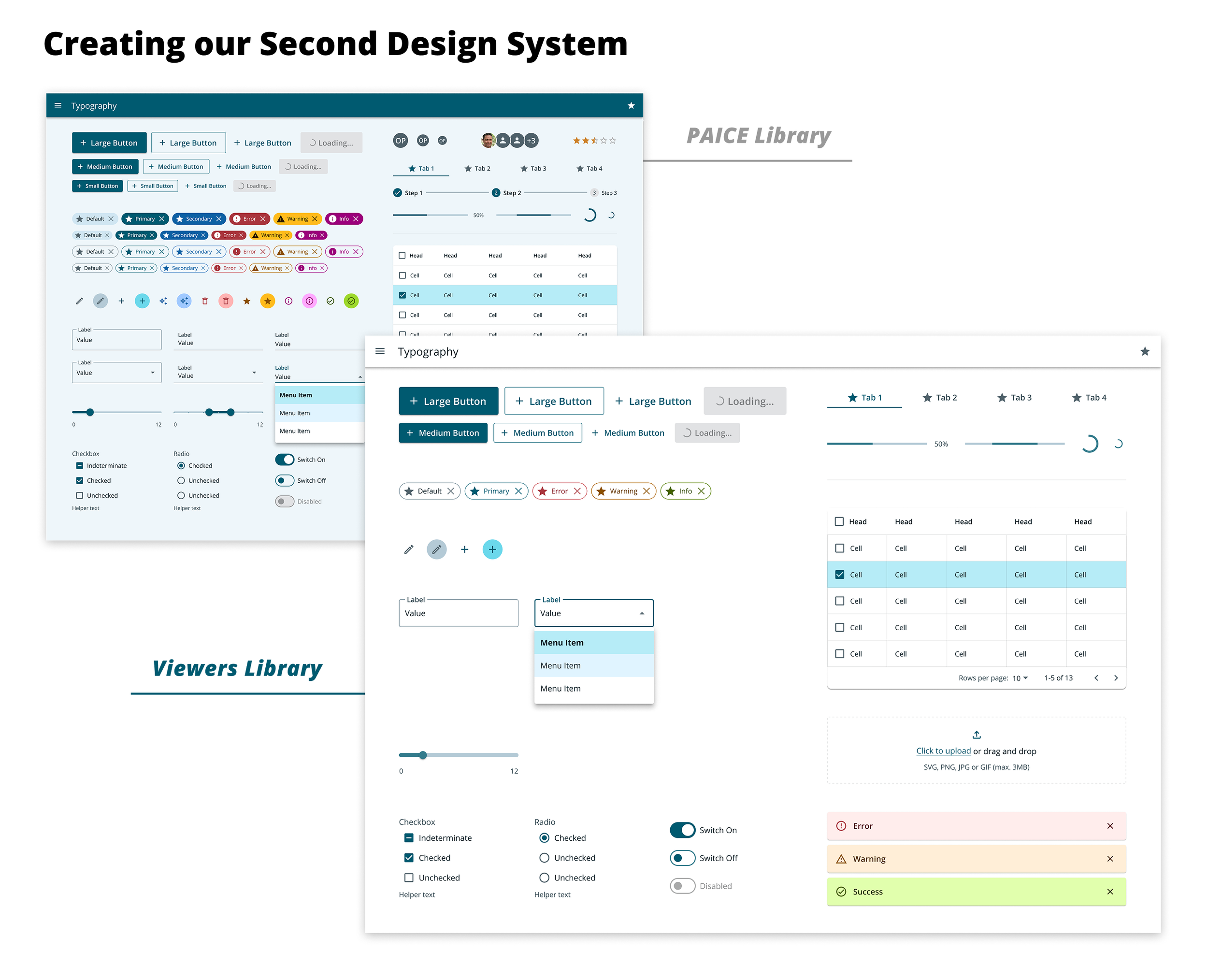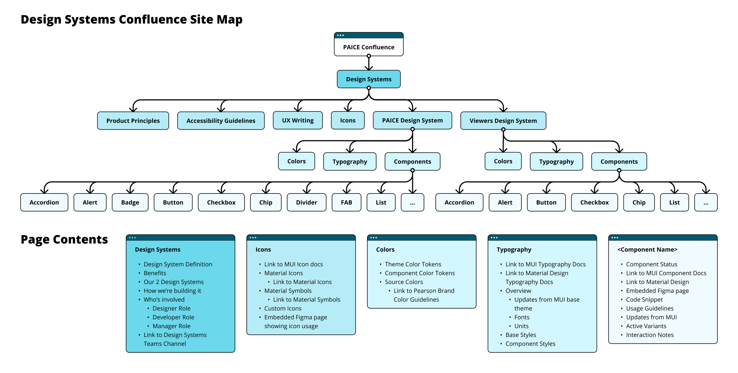 My team established a pair of new interconnected design systems to unify PAICE, Pearson’s suite of authoring, content management and AI tools.