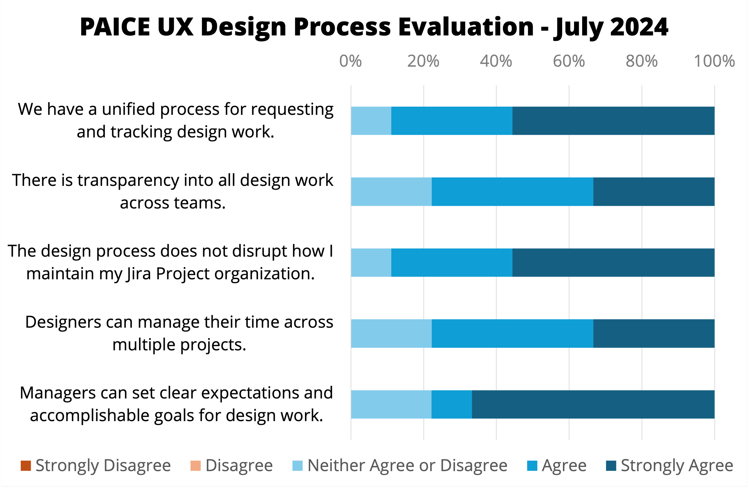 After a year and a half of our process, I sent out anonymous surveys to all the managers working directly with our design team. We received a 4.6 out of 5 satisfaction rating, and the results show that on average 82% of managers agreed or strongly agreed that we met our process goals.