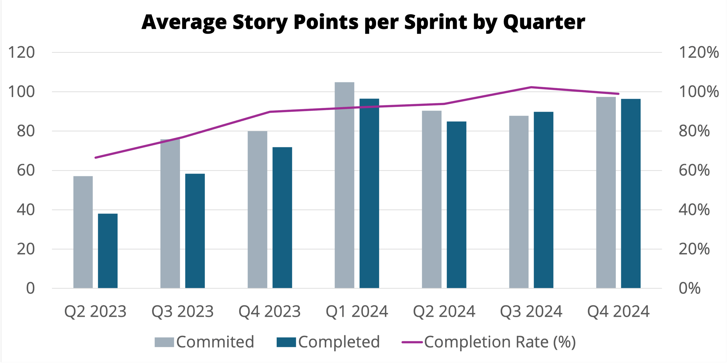 Our process was designed to help our team better manage their time. We delivered on this goal by reducing the disparity between our committed work at the beginning of a sprint and the completed work at the end. At this time we continually deliver between 98-102% of expected work per sprint, which builds trust with our managers and allows us to plan more accurately long-term.