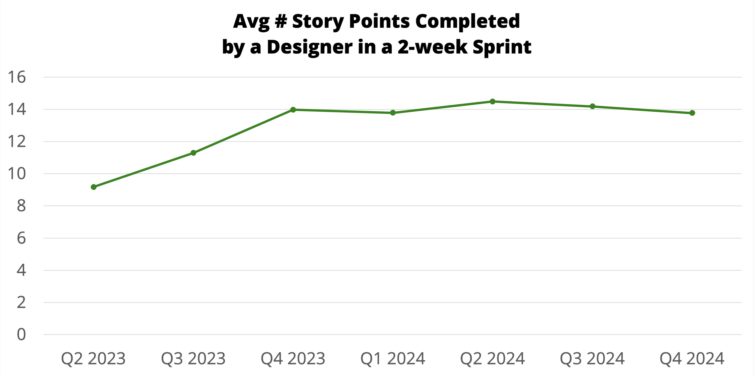 We were able to grow our team to 9 designers and we’re aiming to add at least one more in 2025. Each designer can work seamlessly across 2-3 projects and easily adjust their workload based on their availability. Compared to when we first implemented our process, each designer is completing over 35% more work during each sprint, yet they are able to work more reasonable hours and take more vacation.